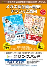 ※印刷の都合により実際の商品と多少色が異なる場合があります。※万一商品が品切れの際は、ご容赦ください。※表示価格は消費税を含んだ総額表示です。地図認定眼鏡士のいる店【見本】○○○メガネ千葉県流山市○○○TEL.000-000-0000確かな知識と技術で、あなたに最適・快適なメガネを提供致します。当店は、認定眼鏡士が視力検査を致します。認定眼鏡士とは、眼鏡業界唯一の資格を持ったメガネのスペシャリストです。フレームレンズケース【使用レンズ】用途に合わせて選べる遠近・中近・近用ワイド大人のためのカジュアルフレームご用意しております。車の運転にかかせないカーナビ。遠近両用ならラクラク見えるよ。秋がも?っと楽しくなる! 老眼鏡セット広告有効期限 2012年○月○日(○)まで遠くも近くもラクラク見える!00,000円( 税込)?選べる老眼鏡レンズ付運転ラクラクで景色も楽しめる。キレイな紅葉に会話も弾むね!遠方まで50? 70cm② AB-0000① AB-0000選べるレンズ付 税込00,000円① BRAND LOGO選べるレンズ付 税込00,000円② BRAND LOGO選べるレンズ付 税込00,000円② BRAND LOGO選べるレンズ付 税込00,000円① BRAND LOGOMen's Ladies'35?40cm1?2m35?40cm○○○○○○○○○○○○、○○○○○○○○○○○○○○。○○○○○○○○○○○○○○○○。○○○○○○○○○○○○、○○○○○○○○○○○○○○。○○○○○○○○○○○○○○○○。① AB-0000② AB-0000遠近両用レンズ中近両用レンズ近用ワイドレンズお出かけ用お買物用お手元用秋がも?っと楽しくなる老眼鏡セットは、以下の3種類よりお好きなレンズをお選びください。※掲載フレームはダミーです。※掲載フレームはダミーです。※印刷の都合により実際の商品と多少色が異なる場合があります。※万一商品が品切れの際は、ご容赦ください。※表示価格は消費税を含んだ総額表示です。地図認定眼鏡士のいる店【見本】○○○メガネ千葉県流山市○○○TEL.000-000-0000確かな知識と技術で、あなたに最適・快適なメガネを提供致します。当店は、認定眼鏡士が視力検査を致します。認定眼鏡士とは、眼鏡業界唯一の資格を持ったメガネのスペシャリストです。フレームレンズケース【使用レンズ】用途に合わせて選べる遠近・中近・近用ワイド大人のためのカジュアルフレームご用意しております。車の運転にかかせないカーナビ。遠近両用ならラクラク見えるよ。秋がも?っと楽しくなる! 老眼鏡セット広告有効期限 2012年○月○日(○)まで遠くも近くもラクラク見える!00,000円( 税込)?選べる老眼鏡レンズ付運転ラクラクで景色も楽しめる。キレイな紅葉に会話も弾むね!遠方まで50? 70cm② AB-0000① AB-0000選べるレンズ付 税込00,000円① BRAND LOGO選べるレンズ付 税込00,000円② BRAND LOGO選べるレンズ付 税込00,000円② BRAND LOGO選べるレンズ付 税込00,000円① BRAND LOGOMen's Ladies'35?40cm1?2m35?40cm○○○○○○○○○○○○、○○○○○○○○○○○○○○。○○○○○○○○○○○○○○○○。○○○○○○○○○○○○、○○○○○○○○○○○○○○。○○○○○○○○○○○○○○○○。① AB-0000② AB-0000遠近両用レンズ中近両用レンズ近用ワイドレンズお出かけ用お買物用お手元用秋がも?っと楽しくなる老眼鏡セットは、以下の3種類よりお好きなレンズをお選びください。貴店の3 3 3 メガネを載せるチラシ御社を「眼鏡市場」・「JINS」・「Zoff」と差別化!秋がより楽しくなる老眼鏡のご提案をします。秋の楽しみの例を挙げ、それぞれに最適なレンズを紹介することにより、遠近・中近・近用ワイドが必要な世代に「自分はこうだから、このレンズか…」と思わせることができます。最近目が見えにくくなってきた人から、今かけているメガネに使いにくさを感じている人まで、幅広く訴えることができます。2.秋がも?っと楽しくなる! 完成イメージ掲載フレームは撮影イメージです。貴店のメガネを撮影して掲載いたします。原寸大サンプル請求は、お電話にて承ります。?04-7145-2959(株式会社サン・スパッド 担当:宮内・高木)オモテ面チラシサイズB4サイズ257×364mm?両面カラー価格は裏表紙にあります秋企画貴店のメガネを撮影3