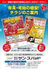 歳末感謝祭\00,000薄型非球面レンズ付セット\0,000◯◯メガネからのクリスマスプレゼントじゃ♪BRAND LOGO2 0 1 3 L A S T C L E A R A N C E S A L E薄型球面レンズHOYA製超特価2枚1組¥税込0,000UV カット防汚コート超薄型非球面レンズHOYA製超特価2枚1組¥税込00,000UV カット防汚薄型非球面レンズコートHOYA製超特価2枚1組¥税込0,000UV カット防汚コート薄型遠近両用レンズNikon製超特価2枚1組¥税込00,000UV カット防汚コート※他店でご購入のメガネ可お得なレンズ交換特別価格!BRAND LOGOBRAND LOGOAB0000 made in china BRAND LOGOAB0000 made in china AB0000made in chinaAB0000made in chinaAB0000 made in JapanAB0000 made in JapanAB0000 made in Japan球面レンズの視界非球面レンズの視界UV カット防汚コート歪みの少ない薄型非球面レンズ付超軽量メガネ薄型非球面レンズ付薄型非球面レンズ付メンズセット\00,000カジュアルブランド薄型非球面レンズ付レディースセット\00,000軽くて丈夫。抜群の使い心地カジュアルブランドJapan Made in安心の純国産新素材ウルテム軽くて丈夫で熱に強い!00/00?までセール開催期間地図認定眼鏡士のいる店【見本】○○○メガネ千葉県流山市○○○TEL.000-000-0000※印刷の都合により実際の商品と多少色が異なる場合があります。※万一商品が品切れの際は、ご容赦ください。※表示価格は消費税を含んだ総額表示です。確かな知識と技術で、あなたに最適・快適なメガネを提供致します。当店は、認定眼鏡士が視力検査を致します。認定眼鏡士とは、眼鏡業界唯一の資格を持ったメガネのスペシャリストです。※掲載フレームはダミーです。※掲載フレームはダミーです。※掲載フレームはダミーです。※掲載フレームはダミーです。※掲載フレームはダミーです。歳末感謝祭\00,000薄型非球面レンズ付セット\0,000◯◯メガネからのクリスマスプレゼントじゃ♪BRAND LOGO2 0 1 3 L A S T C L E A R A N C E S A L E薄型球面レンズHOYA製超特価2枚1組¥税込0,000UV カット防汚コート超薄型非球面レンズHOYA製超特価2枚1組¥税込00,000UV カット防汚薄型非球面レンズコートHOYA製超特価2枚1組¥税込0,000UV カット防汚コート薄型遠近両用レンズNikon製超特価2枚1組¥税込00,000UV カット防汚コート※他店でご購入のメガネ可お得なレンズ交換特別価格!BRAND LOGOBRAND LOGOAB0000 made in china BRAND LOGOAB0000 made in china AB0000made in chinaAB0000made in chinaAB0000 made in JapanAB0000 made in JapanAB0000 made in Japan球面レンズの視界非球面レンズの視界UV カット防汚コート歪みの少ない薄型非球面レンズ付超軽量メガネ薄型非球面レンズ付薄型非球面レンズ付メンズセット\00,000カジュアルブランド薄型非球面レンズ付レディースセット\00,000軽くて丈夫。抜群の使い心地カジュアルブランドJapan Made in安心の純国産新素材ウルテム軽くて丈夫で熱に強い!00/00?までセール開催期間地図認定眼鏡士のいる店【見本】○○○メガネ千葉県流山市○○○TEL.000-000-0000※印刷の都合により実際の商品と多少色が異なる場合があります。※万一商品が品切れの際は、ご容赦ください。※表示価格は消費税を含んだ総額表示です。確かな知識と技術で、あなたに最適・快適なメガネを提供致します。当店は、認定眼鏡士が視力検査を致します。認定眼鏡士とは、眼鏡業界唯一の資格を持ったメガネのスペシャリストです。貴店の3 3 3 メガネを載せるチラシ貴店を「眼鏡市場」・「JINS」・「Zoff」と差別化!クリスマスをイメージするレイアウトとリースをかたどった低価格帯のフレームでインパクトと品揃えの豊富さをアピールし、下部に中価格帯を中心としたフレームを提案することで、取扱い商品の幅広さも伝えることが出来ます。1.歳末感謝祭(タイトルは変更可完成イメージチラシサイズB4サイズ257×370mm両面カラー価格は6ページにあります歳末企画掲載フレームは撮影イメージです。貴店のメガネを撮影して掲載いたします。原寸大サンプル請求は、お電話にて承ります。?04-7145-2959(株式会社サン・スパッド 担当:宮内・高木さえ子)オモテ面貴店のメガネを撮影貴店のメガネを撮影1