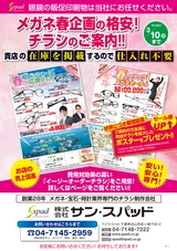 貴店の在庫商品3 3 3 3 3 3 3 を載せるチラシ貴店を「眼鏡市場」・「JINS」・「Zoff」と差別化!※印刷の都合により実際の商品と多少色が異なる場合があります。※万一商品が品切れの際は、ご容赦ください。※表示価格は消費税を含んだ総額表示です。地図【見本】○○○メガネ千葉県流山市○○○TEL.000-000-0000認定眼鏡士のいる店確かな知識と技術で、あなたに最適・快適なメガネを提供致します。当店は、認定眼鏡士が視力検査を致します。認定眼鏡士とは、眼鏡業界唯一の資格を持ったメガネのスペシャリストです。ご購入はお早めに!花粉防止メガネ0,000円税込よりUVカットくもり止めゆがみが少なく見やすいレンズで新生活を応援! 薄型非球面レンズ付UVカット撥水コート\0,000税込よりクーポンご利用でBrand logoBrand logoBrand logoBrand logoBrand logoBrand logoBrand logo Brand logoBrand logoBrand logo\00,000税込AB0000 mede in china 通常価格00,000円を…薄型非球面レンズ付クーポンご利用で\00,000税込AB0000 mede in china 通常価格00,000円を…薄型非球面レンズ付クーポンご利用で\00,000税込AB0000 mede in china 通常価格00,000円を…薄型非球面レンズ付クーポンご利用で\00,000税込AB0000 mede in china 通常価格00,000円を…薄型非球面レンズ付クーポンご利用で\00,000税込AB0000 mede in china 通常価格00,000円を…薄型非球面レンズ付クーポンご利用でBrand logo\00,000税込AB0000 mede in china 通常価格00,000円を…薄型非球面レンズ付クーポンご利用でBrand logo\0,000税込AB0000 mede in china 通常価格00,000円を…薄型非球面レンズ付クーポンご利用で\00,000税込AB0000 mede in china 通常価格00,000円を…薄型非球面レンズ付クーポンご利用でAB0000 mede in china薄型非球面レンズ付AB0000 mede in china薄型非球面レンズ付AB0000 mede in china薄型非球面レンズ付\00,000税込通常価格00,000円を…クーポンご利用で\00,000税込通常価格00,000円を…クーポンご利用で\00,000税込通常価格00,000円を…クーポンご利用でAB0000 mede in china薄型非球面レンズ付\00,000税込通常価格00,000円を…クーポンご利用でフェア期間 3/00(月)~4/00(金)まで※他の割引券との併用は出来ません。ご精算時に必ず本券をご提示ください。00,000円以上のメガネセットで00%OFFクーポン有効期限:2015年0月00日?までセール価格よりさらに●●●メガネ※掲載フレームはダミーです。※掲載フレームはダミーです。※掲載フレームはダミーです。※掲載フレームはダミーです。※掲載フレームはダミーです。※掲載フレームはダミーです。※掲載フレームはダミーです。※掲載フレームはダミーです。※掲載フレームはダミーです。※印刷の都合により実際の商品と多少色が異なる場合があります。※万一商品が品切れの際は、ご容赦ください。※表示価格は消費税を含んだ総額表示です。地図【見本】○○○メガネ千葉県流山市○○○TEL.000-000-0000認定眼鏡士のいる店確かな知識と技術で、あなたに最適・快適なメガネを提供致します。当店は、認定眼鏡士が視力検査を致します。認定眼鏡士とは、眼鏡業界唯一の資格を持ったメガネのスペシャリストです。ご購入はお早めに!花粉防止メガネ0,000円税込よりUVカットくもり止めゆがみが少なく見やすいレンズで新生活を応援! 薄型非球面レンズ付UVカット撥水コート\0,000税込よりクーポンご利用でBrand logoBrand logoBrand logoBrand logoBrand logoBrand logoBrand logo Brand logoBrand logoBrand logo\00,000税込AB0000 mede in china 通常価格00,000円を…薄型非球面レンズ付クーポンご利用で\00,000税込AB0000 mede in china 通常価格00,000円を…薄型非球面レンズ付クーポンご利用で\00,000税込AB0000 mede in china 通常価格00,000円を…薄型非球面レンズ付クーポンご利用で\00,000税込AB0000 mede in china 通常価格00,000円を…薄型非球面レンズ付クーポンご利用で\00,000税込AB0000 mede in china 通常価格00,000円を…薄型非球面レンズ付クーポンご利用でBrand logo\00,000税込AB0000 mede in china 通常価格00,000円を…薄型非球面レンズ付クーポンご利用でBrand logo\0,000税込AB0000 mede in china 通常価格00,000円を…薄型非球面レンズ付クーポンご利用で\00,000税込AB0000 mede in china 通常価格00,000円を…薄型非球面レンズ付クーポンご利用でAB0000 mede in china薄型非球面レンズ付AB0000 mede in china薄型非球面レンズ付AB0000 mede in china薄型非球面レンズ付\00,000税込通常価格00,000円を…クーポンご利用で\00,000税込通常価格00,000円を…クーポンご利用で\00,000税込通常価格00,000円…クーポンご利用でAB0000 mede in china薄型非球面レンズ付\00,000税込通常価格00,000円を…クーポンご利用でフェア期間 3/00(月)~4/00(金)まで※他の割引券との併用は出来ません。ご精算時に必ず本券をご提示ください。00,000円以上のメガネセットで00%OFFクーポン有効期限:2015年0月00日?までセール価格よりさらに●●●メガネ春らしいイメージを全面に、新入学・新社会人に新しいメガネ購入を促すチラシデザインです。チラシのお得感もクーポンを付ける事で演出します。さらに、トレンドとして新素材のメガネも掲載します。掲載フレームは撮影イメージです。貴店のメガネを撮影